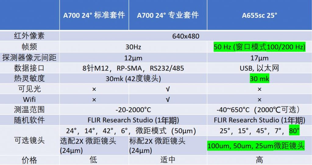两款产品的红外分辨率都是640 x 480像素,A700系列采用了全新设计,体积更小,电子性能提升,并加入了可见光和WiFi等选项,主要区别如下: